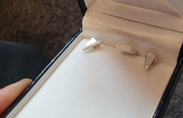 Geometric design, right angle triangle earrings with a subtle bevel on the long side. Catches the light well and makes for a good sparkle.