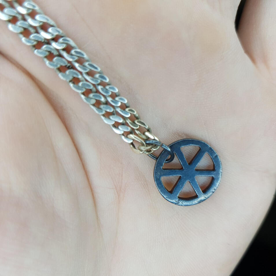 A sterling silver piece of fandom for those that like "The Name of the Wind" from the King Killer Chronicals, mounted on my gold and silver chain.Made using scrap metal and dust, brought together with fire and the face of a blacksmiths anvil, a nice parallel to the story of the Iron Wheel in the KKC.